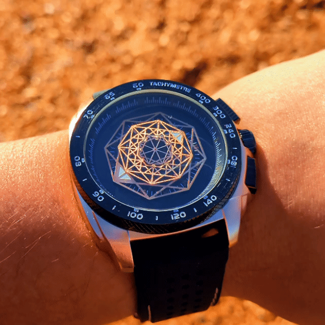 INNOVATIVE ROTATING DIAL: The watch features a groundbreaking 3-layer rotating dial with luminous detailsvv that replaces traditional minute and second hands, offering a distinctive way to track time with dynamic visual appeal.